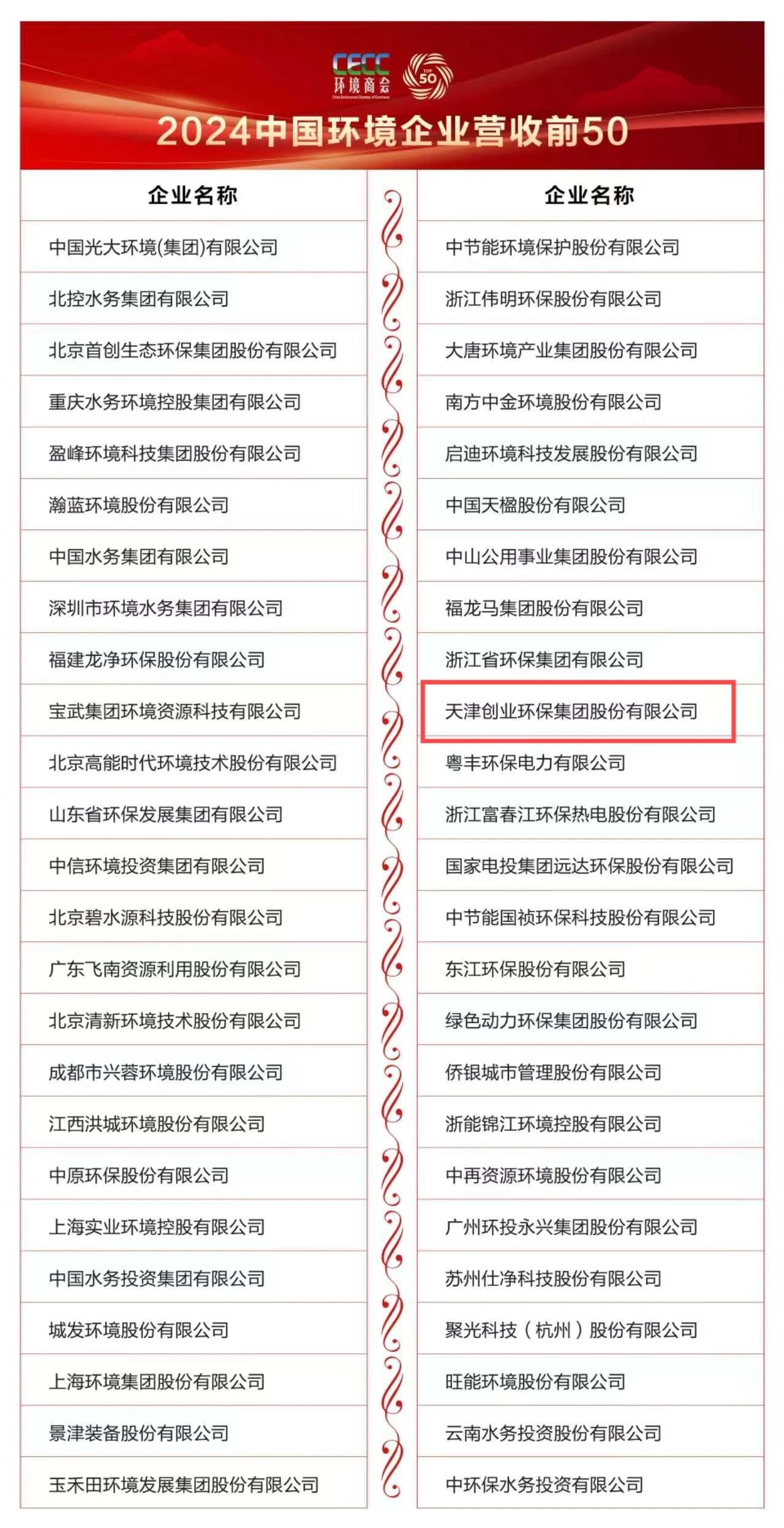 2024中國環(huán)境企業(yè)營收前50公布,創(chuàng)業(yè)環(huán)保連續(xù)七年榮登榜單