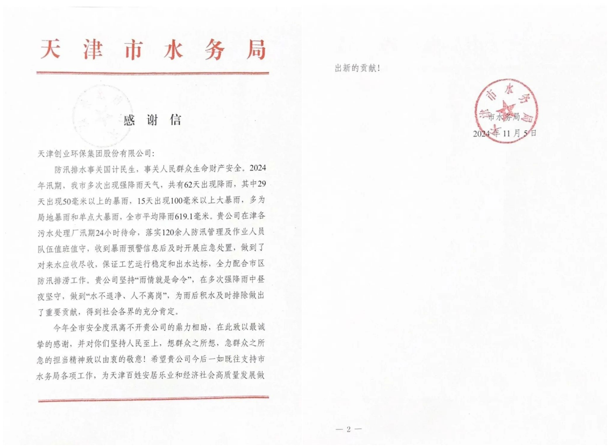 日前,創(chuàng)業(yè)環(huán)保集團收到了來自市水務局的感謝信,對集團在2024年汛期期間全力配合市區(qū)防汛排澇工作做出的積極貢獻表示肯定與感謝。