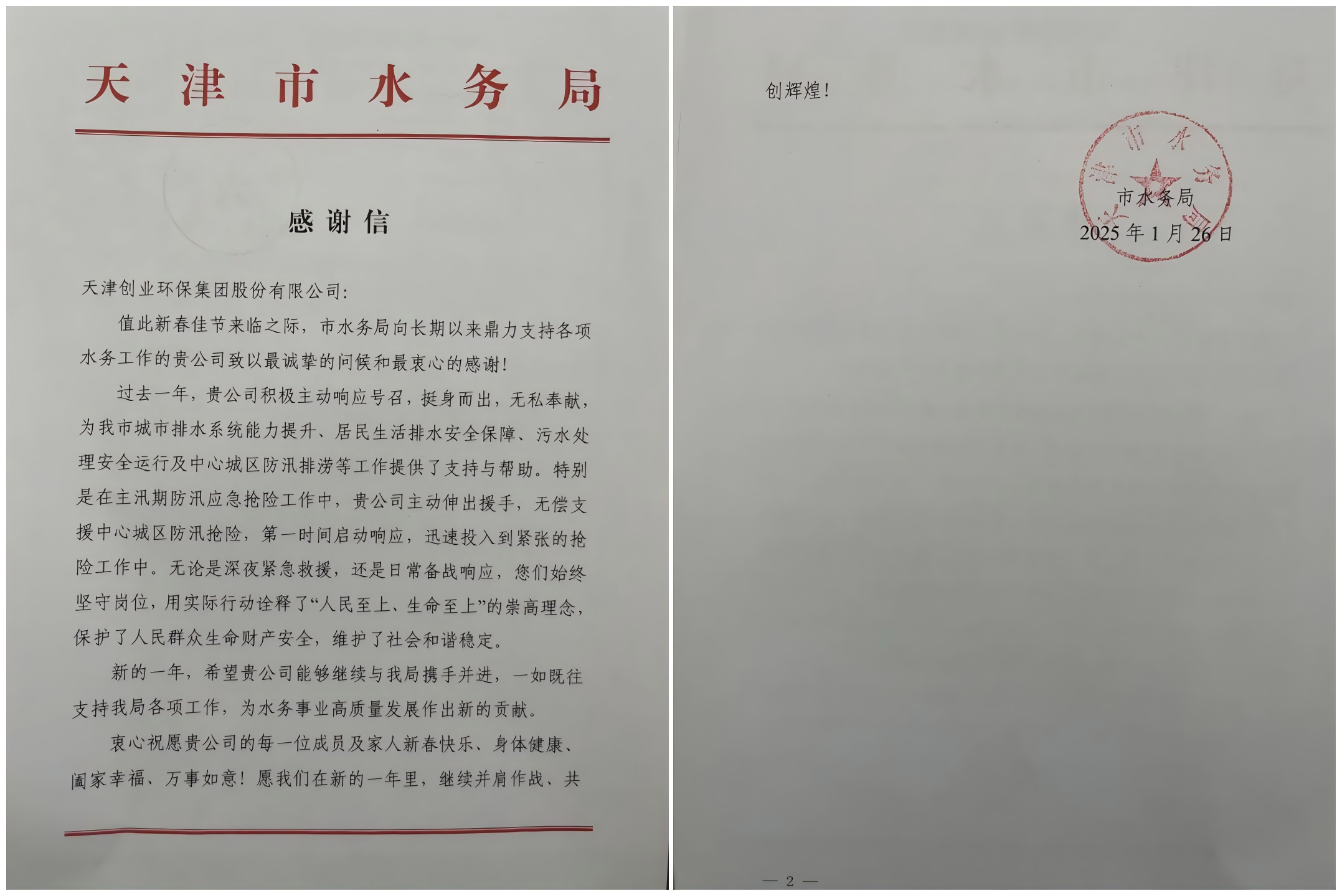 近日,創(chuàng)業(yè)環(huán)保集團(tuán)收到一封來自市水務(wù)局的感謝信,對創(chuàng)業(yè)環(huán)保集團(tuán)一年來積極主動支持、響應(yīng)市水務(wù)局各項工作和號召,配合開展城市排水系統(tǒng)能力提升、居民生活排水安全保障、污水處理安全運行和中心城區(qū)防汛排澇等工作,用實際行動詮釋“人民至上、生命至上”的崇高理念表示高度認(rèn)可,希望創(chuàng)業(yè)環(huán)保集團(tuán)在2025年繼續(xù)為水務(wù)事業(yè)高質(zhì)量發(fā)展作出新的貢獻(xiàn)。